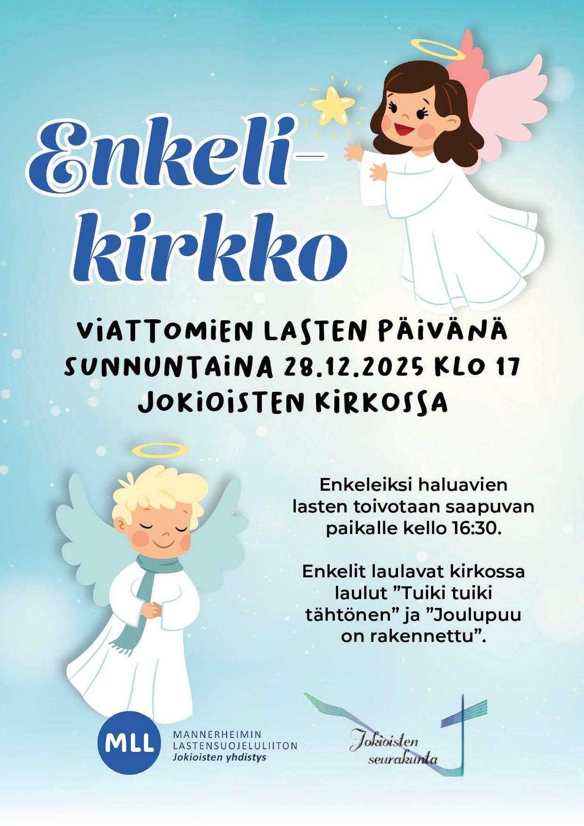 Perinteinen enkelikirkko järjestetään yhdessä Jokioisten seurakunnan kanssa tänäkin vuonna viattomien lasten päivänä, sunnuntaina 28. joulukuuta klo 17. Enkeliksi haluavien lasten toivotaan olevan paikalla noin puolta tuntia aikaisemmin.